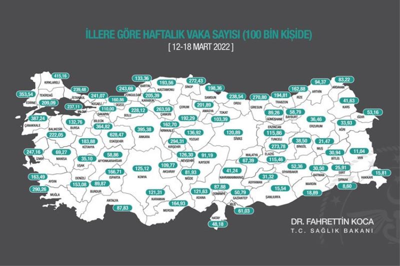 ANKARA (İGFA) - Sağlık Bakanı Fahrettin Koca, illere göre haftalık COVID-19 vaka sayısı haritasını paylaştı.