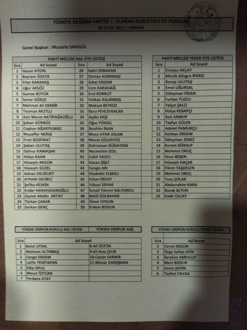 Sarıgül, liderliğindeki yeni yönetimini yeniden şekillendirdi. Bursa'dan Sarıgül'e yakınlıklarıyla bilinen Hüseyin Kaçar Meclis Üyeliği'ne getirilirken, Yüksek  Disiplin Kurulu'na ise TDP İznik eski İlçe Başkanı Ferdane Atay görevlendirildi.